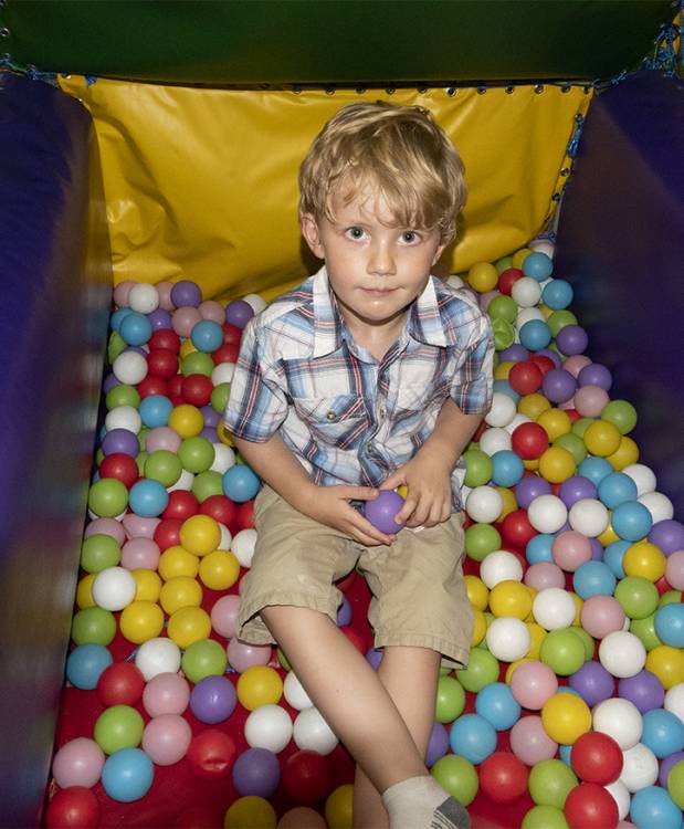 A double decker Bus converted into a soft play centre with racing slides, ball pit, soft assault course, music and party lights.